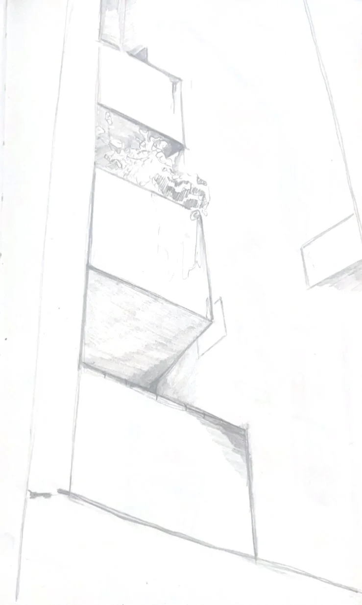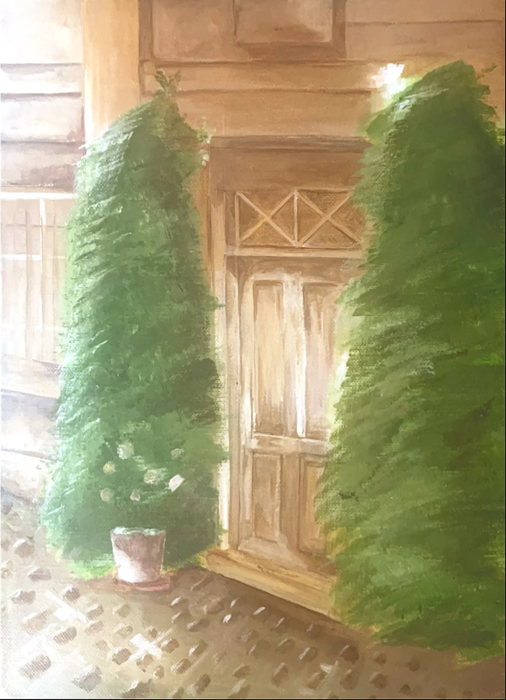 To creatively engage with the observations from my experience doing dérive, I began painting the sketches which stood out to me most. A plant on the balcony of a stairwell, Plants in front of a door and a plant out an apartment window. I was becoming more curious about the shared relationship between nature and humans in the city.